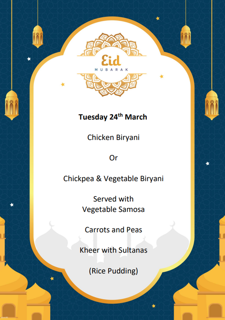 World Book Day Menu 5th March 2026 Eid Mubarak Menu 24th March 2026