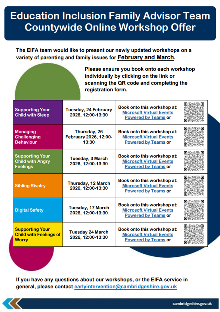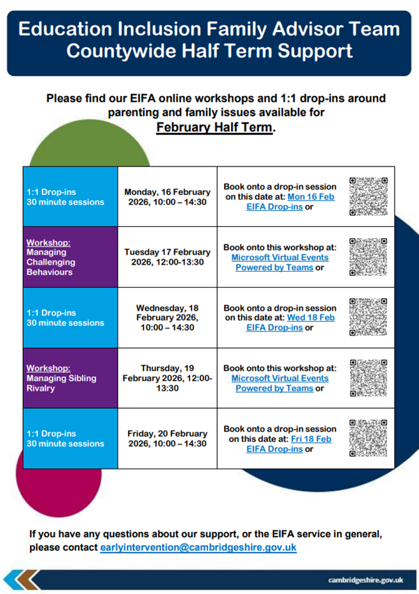 Online Workshops - the EIFA team offer online workshops covering a variety of parenting and family issues. Please see below and here for more information. For more details of the February half term workshops please click here.
