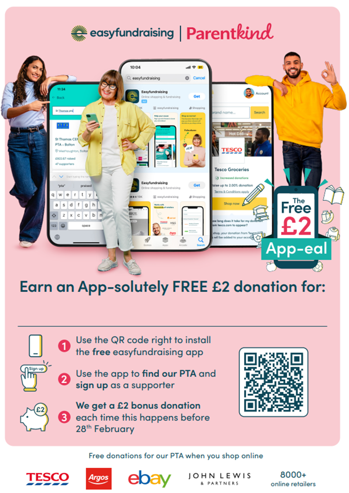 Please support our PTFA - a simple way is to sign up to easyfundraising by downloading their app. The PTFA will receive £2 for every new member who downloads the app and you can then shop online with 8,000+ retailers, with the PTFA receiving further donations as you shop.